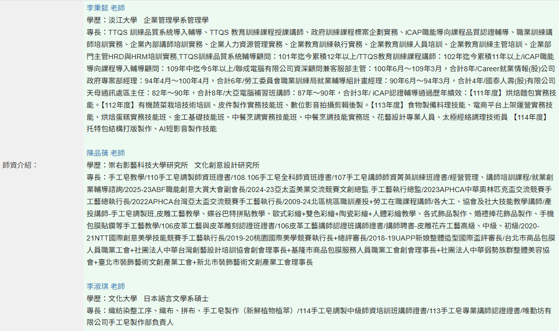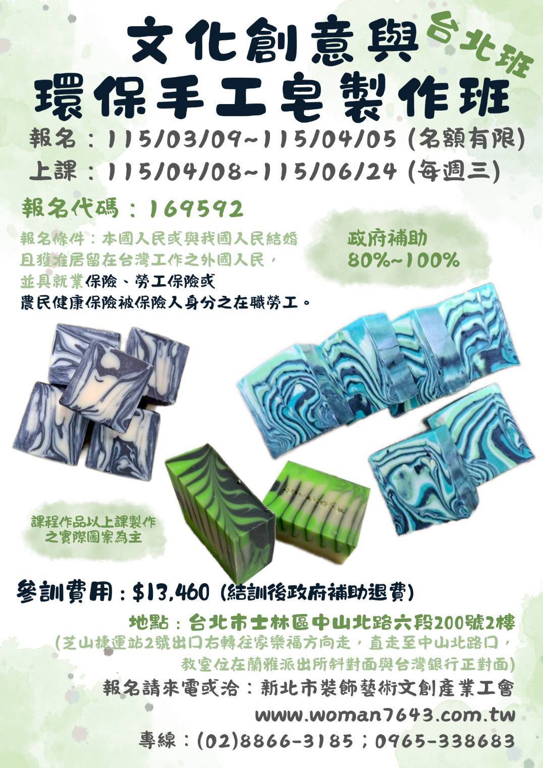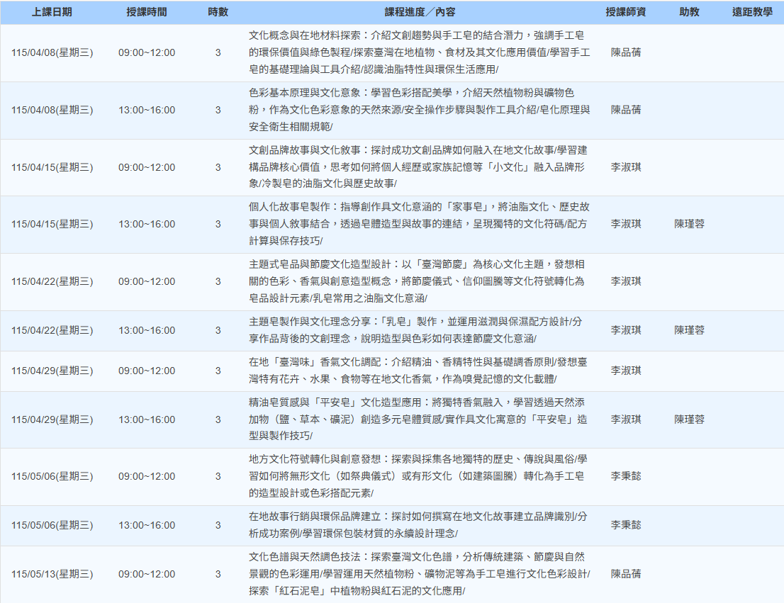 2026-04-08 115上(台北)文化創意與環保手工皂製作班第01期 課程代碼:169592 ► 課程日期/時數:115年4月8號-115年6月24日/72小時 ► 上課時段:每週三9:00~12:00;13:00~16:00上課 ► 報名人數:20人 ► 報名起訖日:115/03/09 12:00 ~ 115/04/05 18:00 ► 報名網址:https://ojt.wda.gov.tw/ClassSearch/Detail?OCID=169592&plantype=1 上課地點: 111047臺北市士林區中山北路六段200號2樓 課程費用: 教學內容: 師資介紹: 報名資格: 學員學歷:不限 報名條件:本國人民或與我國人民結婚且獲准居留在台灣工作之外國人民,並具就業保險、勞工保險或農民健康保險被保險人身分之在職勞工。 注意事項: 【退費辦法】 ※參訓學員已繳納訓練費用,但因個人因素,於開訓前辦理退訓者,訓練單位應依下列規定辦理退費: (一) 非學分班訓練單位最多得收取本署核定訓練費用百分之五,餘者退還學員。(二) 學分班退費標準依教育部規定辦理。 已開訓但未逾訓練總時數三分之一者,訓練單位應退還本署核定訓練費用百分之五十。匯款退費者,學員須自行負擔匯款手續費用或於退款金額中扣除。已逾訓練總時數三分之一者,不予退費。 ※訓練單位有下列情事之ㄧ者,應全數退還學員已繳交之費用: (一) 因故未開班。(二) 未如期開班。(三) 因訓練單位未落實參訓學員資格審查,致有學員不符補助資格而退訓者。訓練單位如變更訓練時間、地點或其他重大缺失等,致學員無法配合而需退訓者,訓練單位應依未上課時數佔訓練總時數之比例退還學員訓練費用。因訓練單位之原因,致學員無法於結訓後六個月內取得本計畫補助金額,訓練單位應先代墊補助款項。經司法判決確定或經認定非可歸責於訓練單位者,得另檢具證明向分署申請代墊補助款項。匯款退費者,由訓練單位負擔匯款手續費用。 歡迎來電洽詢 02-8866-3185 回上一頁