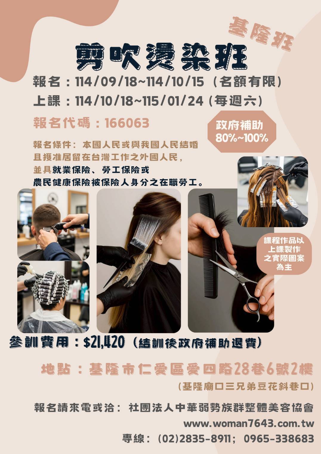 2025-10-18 114下(基隆)剪吹燙染班第01期 課程代碼:166063 剪燙吹染班 基隆場 報名代碼:166063 上課地點: 基隆市仁愛區愛四路28巷6號2樓(基隆廟口三兄弟豆花斜巷口) 課程費用: 報名時應先繳全額訓練費用 21,420 學員負擔:4,284 政府負擔:17,136 每班人數:25 人 訓練時數:90 小時 ► 報名起訖日:114/09/18 12:00 ~ 114/10/15 18:00 ► 報名網址:https://ojt.wda.gov.tw/ClassSearch/Detail?OCID=166063&plantype=1 #上課時間114年10月18日至115年01月24日(星期六) #上課地址基隆市仁愛區愛四路28巷6號2樓(基隆廟口三兄弟豆花斜巷口) 回上一頁