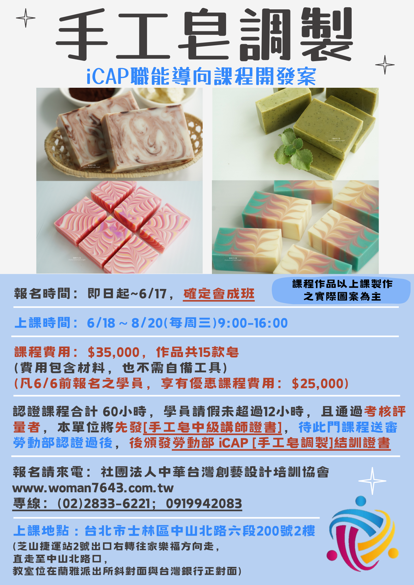 待此門課程送審勞動部認證過後,後頒發勞動部 iCAP [手工皂調製]結訓證書
