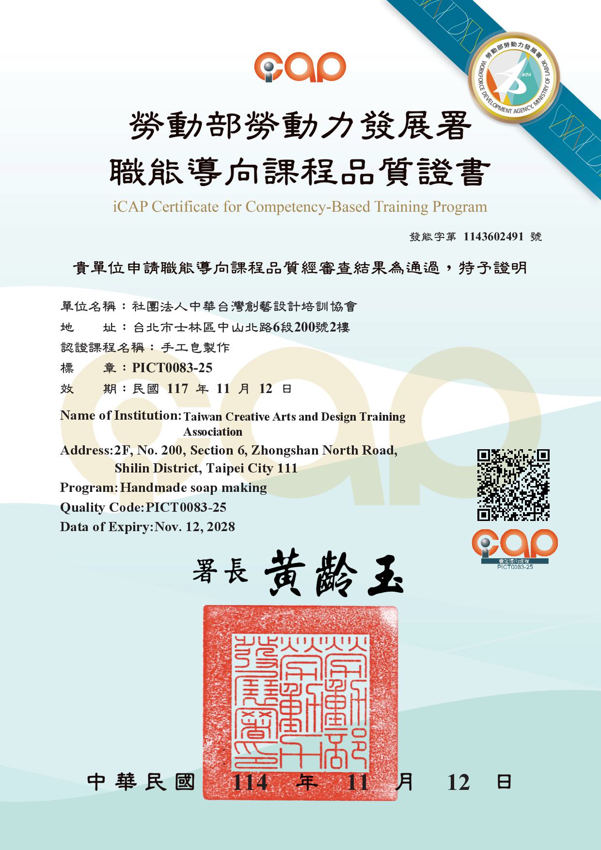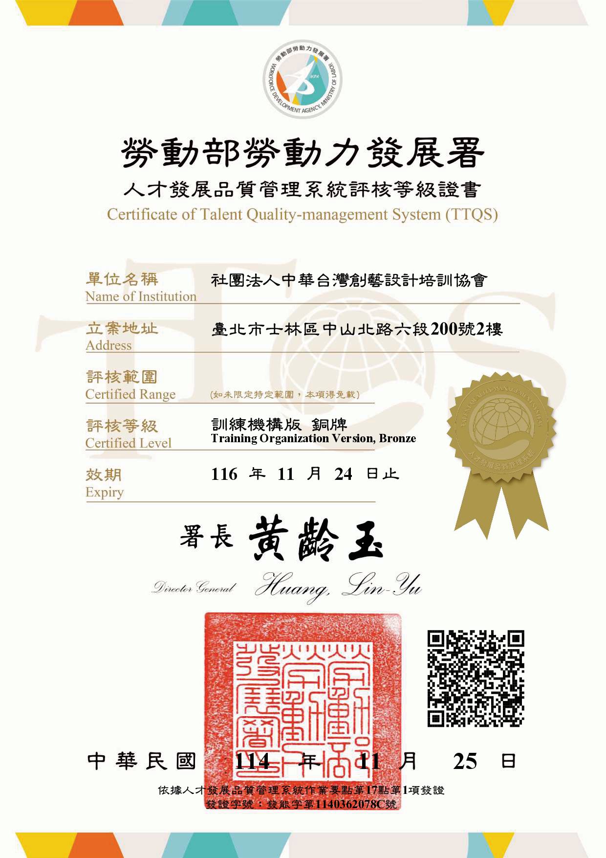 本單位獲得TTQS評核銅牌,依據本會章程辦理各項教育訓練,以倡導文創工藝(包含彩繪藝術、皮革工藝等等)、人力資源、藝術設計、生活應用、設計美學技職之培訓。提供會員及非會員學習成長,提昇創意美學概念專業。協助創意設計美學專長,培訓相關之人才、輔導就業創業,提升就業率,善盡社會責任義務,保障會員權益,促進家庭溫馨和樂為宗旨。